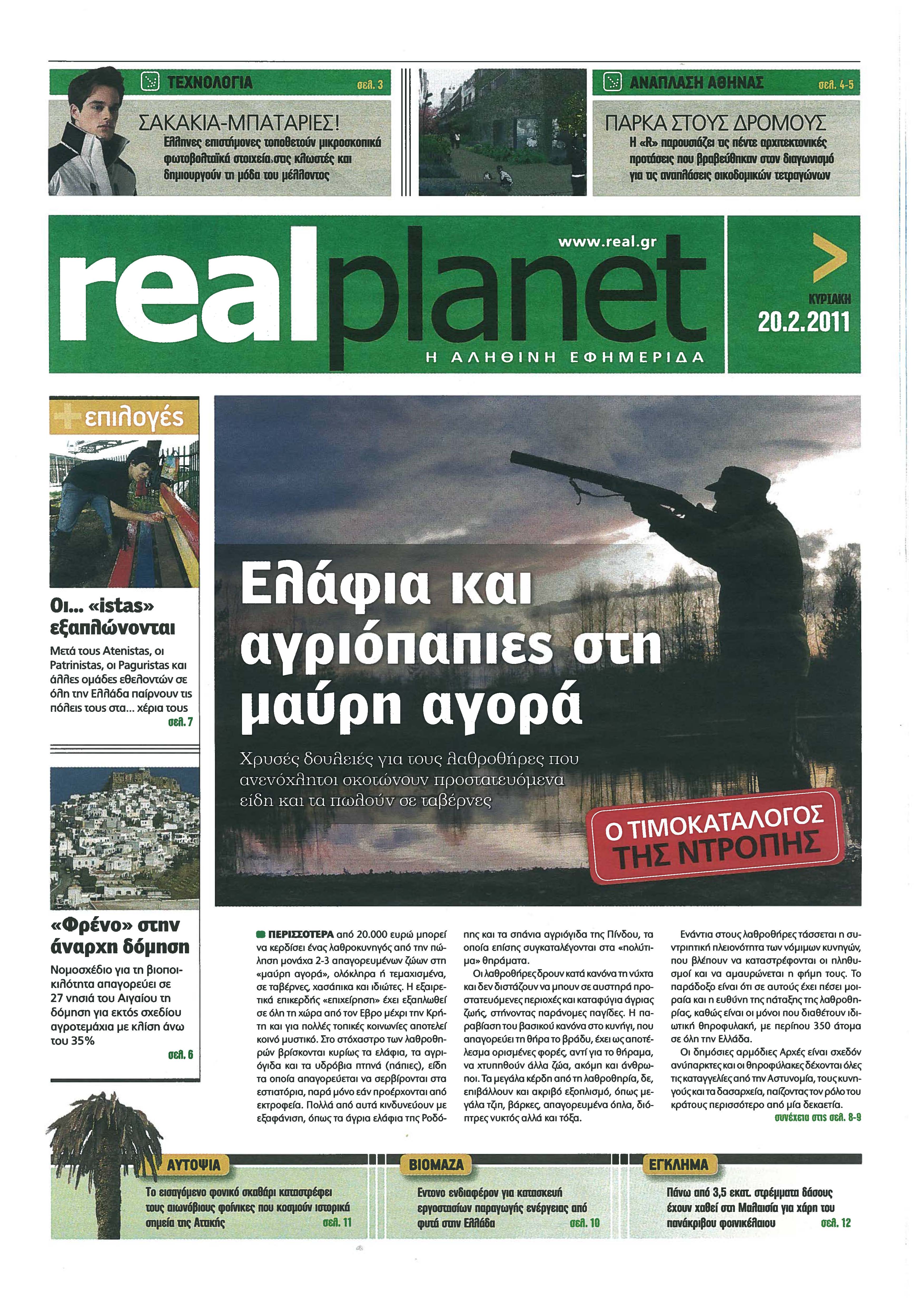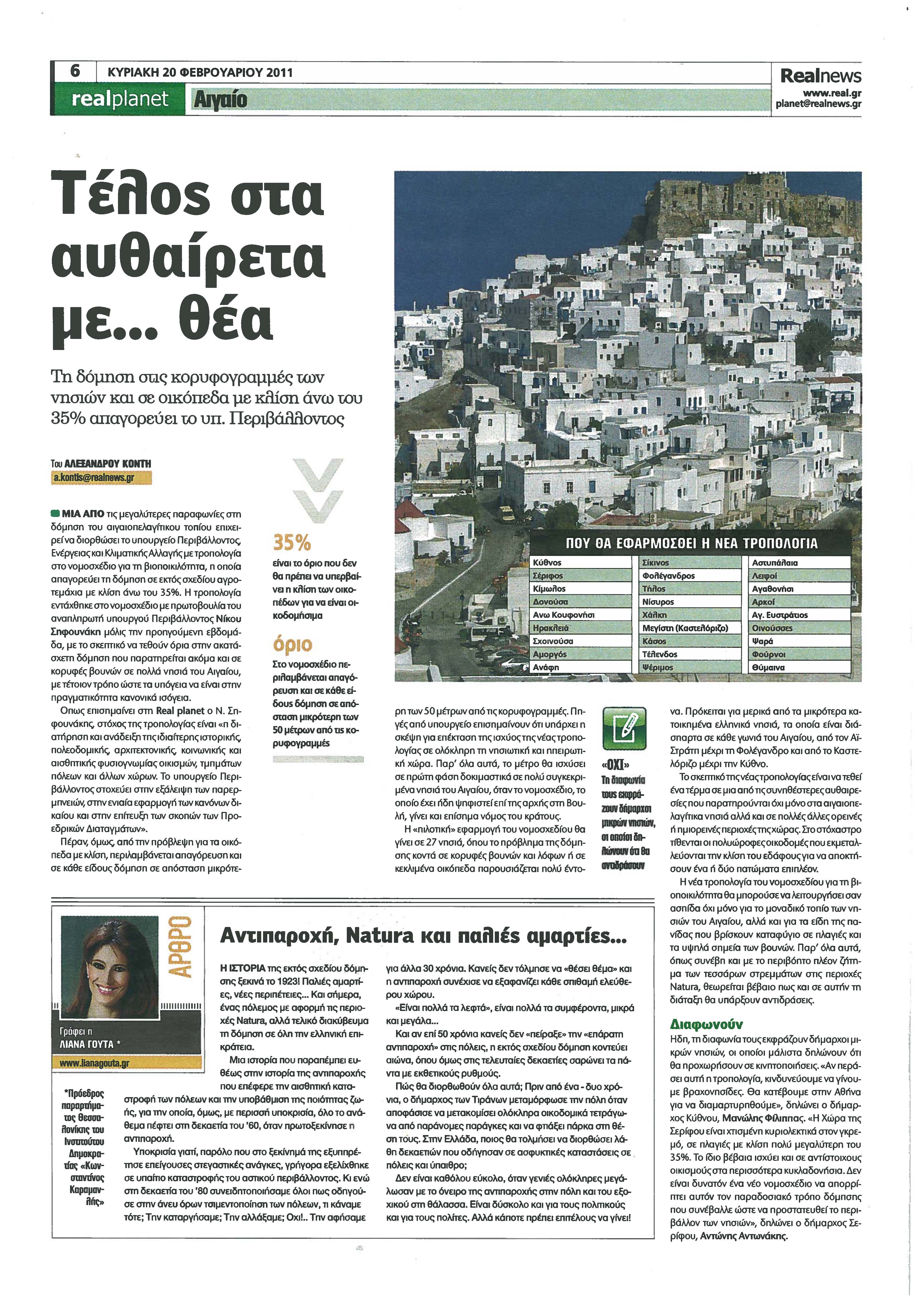 Άρθρο της Λιάνας στο REAL PLANET, στα πλαίσια ρεπορτάζ με θέμα «Φρένο στην άναρχη δόμηση»…. «Η ιστορία της εκτός σχεδίου δόμησης ξεκινά το 1923! Παλιές αμαρτίες, νέες περιπέτειες… Και σήμερα, ένας πόλεμος με αφορμή τις περιοχές Natura αλλά τελικό διακύβευμα τη δόμηση σε όλη την ελληνική επικράτεια….!» Διαβάστε το δημοσίευμα / Το εξώφυλλο της Real Planet / Διαβάστε το άρθρο σε word / AETOS HALKIDIKIS