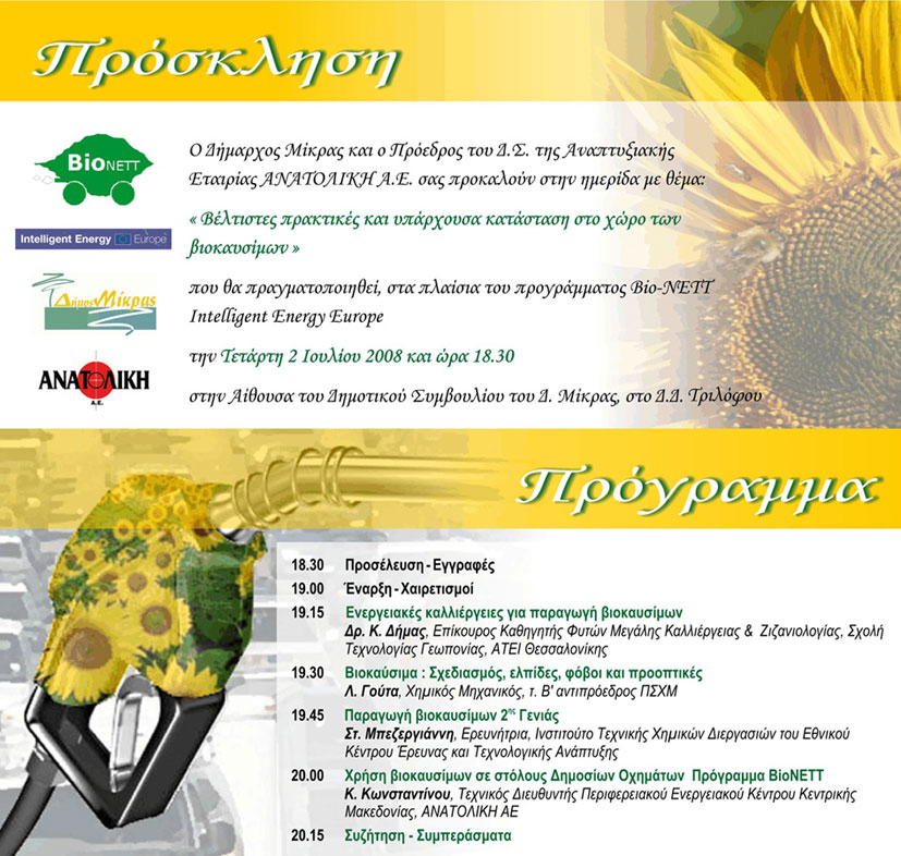 Ομιλία σε ημερίδα με θέμα «Βέλτιστες πρακτικές και υπάρχουσα κατάσταση στο χώρο των βιοκαυσίμων» που θα πραγματοποιηθεί στα πλαίσια του προγράμματος BioNETT την 2-7-08 στο ΔΔ Τριλόφου