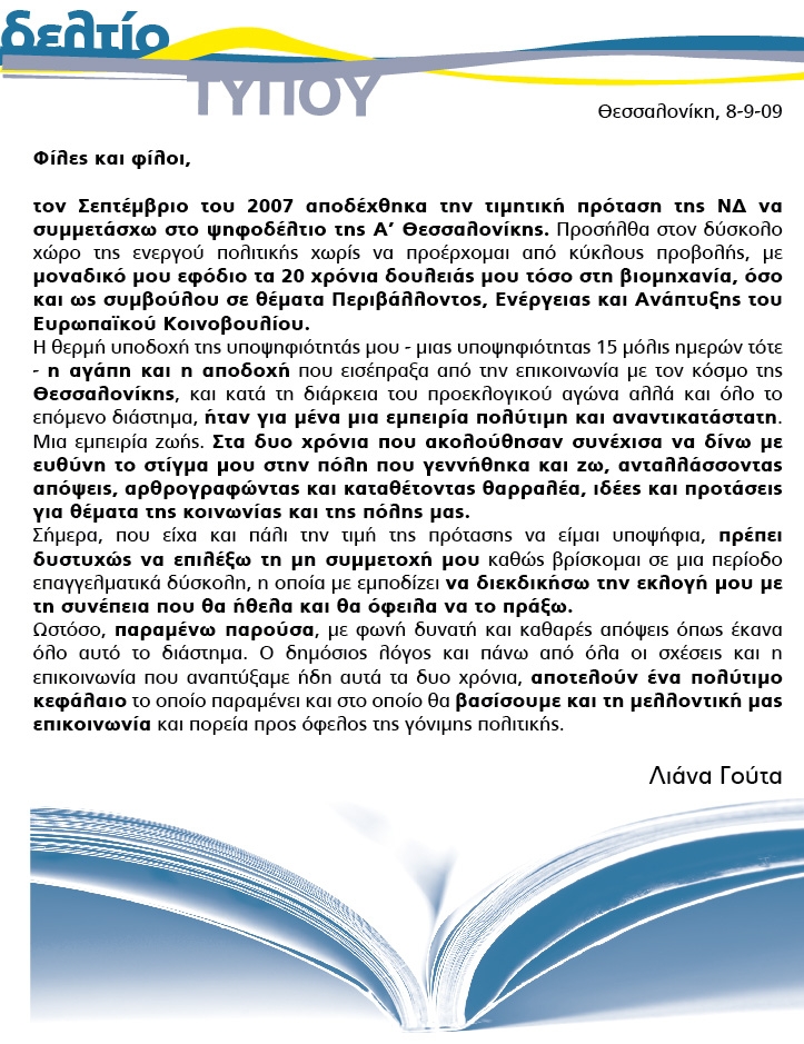 «Φίλες και φίλοι,Τον Σεπτέμβριο του 2007 αποδέχθηκα την τιμητική πρόταση της ΝΔ να συμμετάσχω στο ψηφοδέλτιο της Α’ Θεσσαλονίκης. Προσήλθα στον δύσκολο χώρο της ενεργού πολιτικής χωρίς να προέρχομαι από κύκλους προβολής, με μοναδικό μου εφόδιο τα 20 χρόνια δουλειάς μου τόσο στη βιομηχανία, όσο και ως….» Διαβάστε το Δελτίο Τύπου