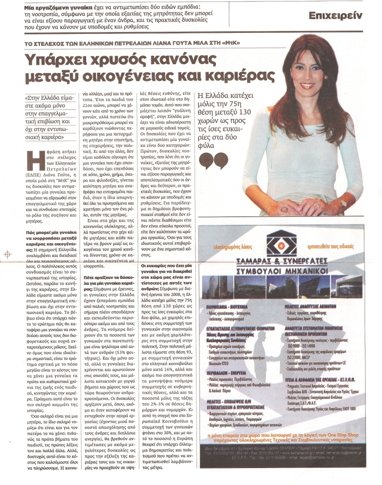 “Στην Ελλάδα είμαστε ακόμα μόνο στην επαγγελματική επιβίωση και όχι στην εντυπωσιακή καριέρα”. Η φράση ανήκει στο στέλεχος των Ελληνικών Πετρελαίων (ΕΛΠΕ) Λιάνα Γούτα, η οποία μιλά στη “ΜτΚ” για τις δυσκολίες που αντιμετωπίζει μία γυναίκα προκειμένου να εδραιωθεί στον επαγγελματικό της χώρο και να συνδυάσει επιτυχώς το ρόλο της συζύγου και μητέρας. / Η δημοσίευση Το κείμενο της συνέντευξης